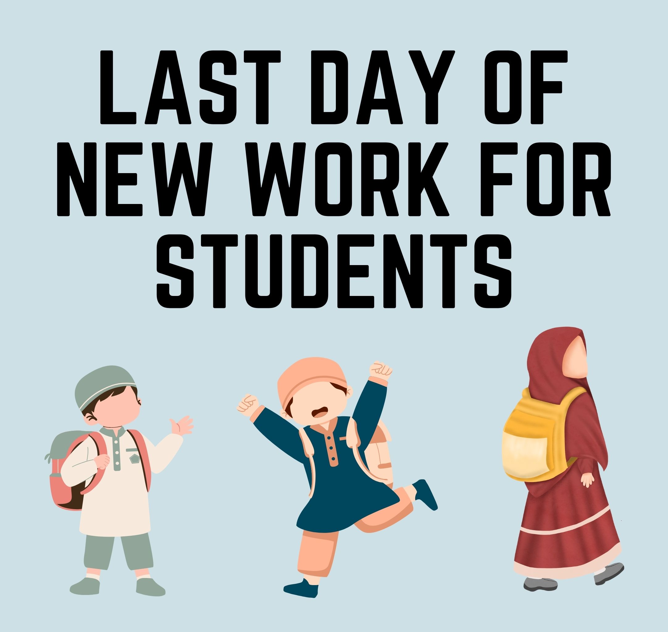 Last Day of New Work for Students — Final day for teachers to assign new classwork before the grading period closes. A good time to focus on completing assignments.